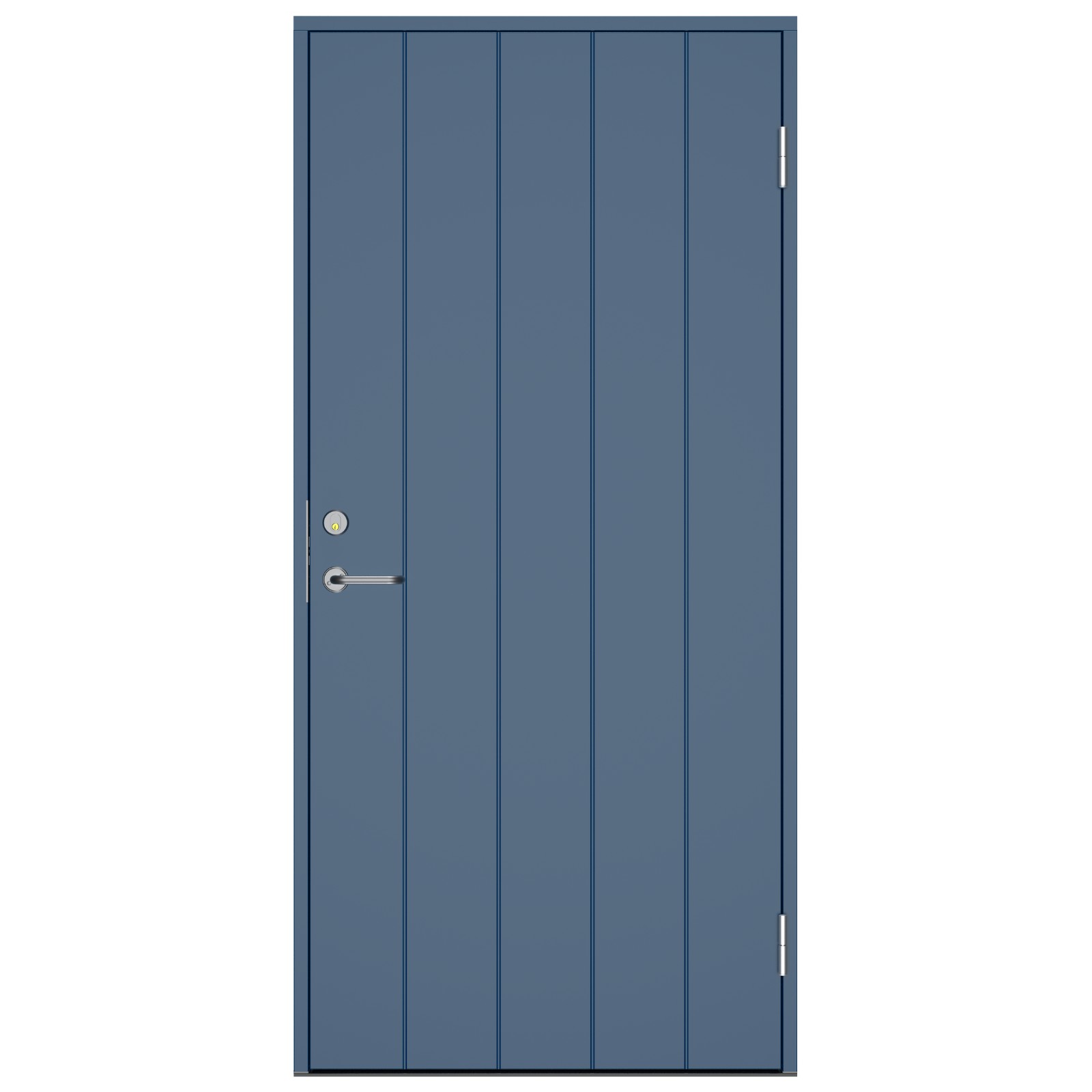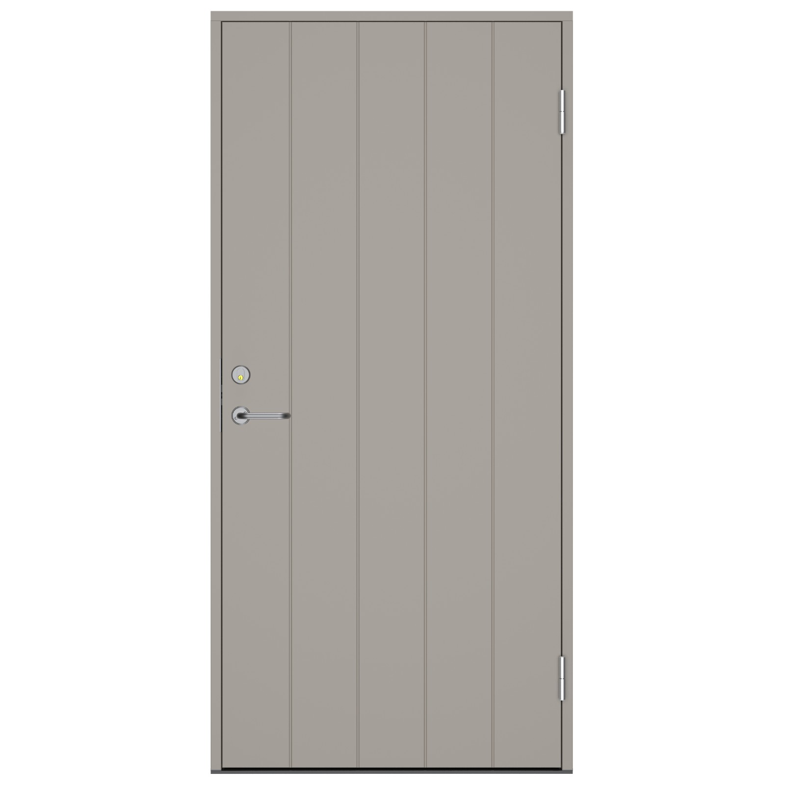 Ytterdøreren har en kjerne av EPS med heldekkende aluminiumsplater på begge sider. Dørbladtykkelse 60 mm. Syreherdende maling med høy motstand, glansverdi ca 25-30. Låskasse ASSA 8765 med sikkerhets sluttstykke i karm. To tappbærende hengsler med bakkantsikring.