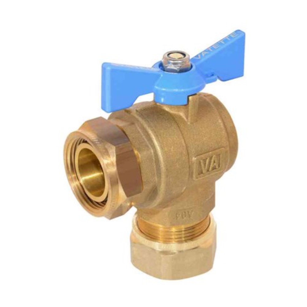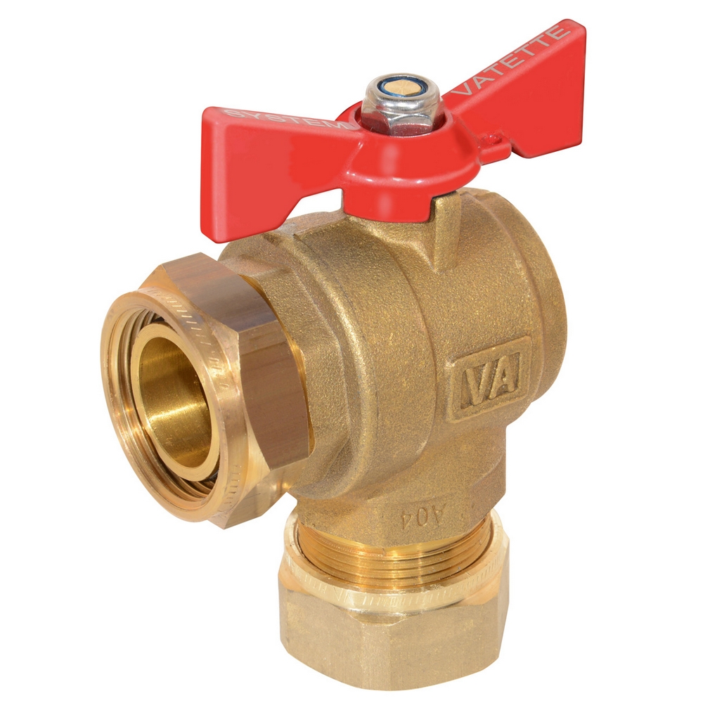 Kuleventil Vatette 22xG20 Vinkel Løp er en kuleventil som kobles til en Vatette Dy 22 mm kobling med en 22 mm klemring i den andre enden. Den er i vinkelutførelse og har et farget dreiehåndtak. Den passer for eksempel som avstengningsventil til Vatette fordeler med Dy 22 mm tilkobling.