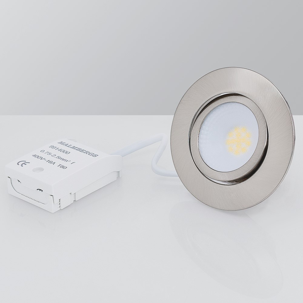 Downlight Malmbergs Home MD-230 LED-downlight der du slipper driver for enklere installasjon. Downlighten er for innfelt montering, og er vippbar 25°. Kobles til hurtigkoblingsklemme 4x2,5 mm². Det er mulighet for viderekobling med strekkavlaster for kabel alt. flexrør 16 mm. Dimbar med bakkantstyrt transistordimmer (RC). Dobbelisolert og S-merket. Innbyggingdybde: 22 mm (OBS! høyde koblingsboks 23 mm).