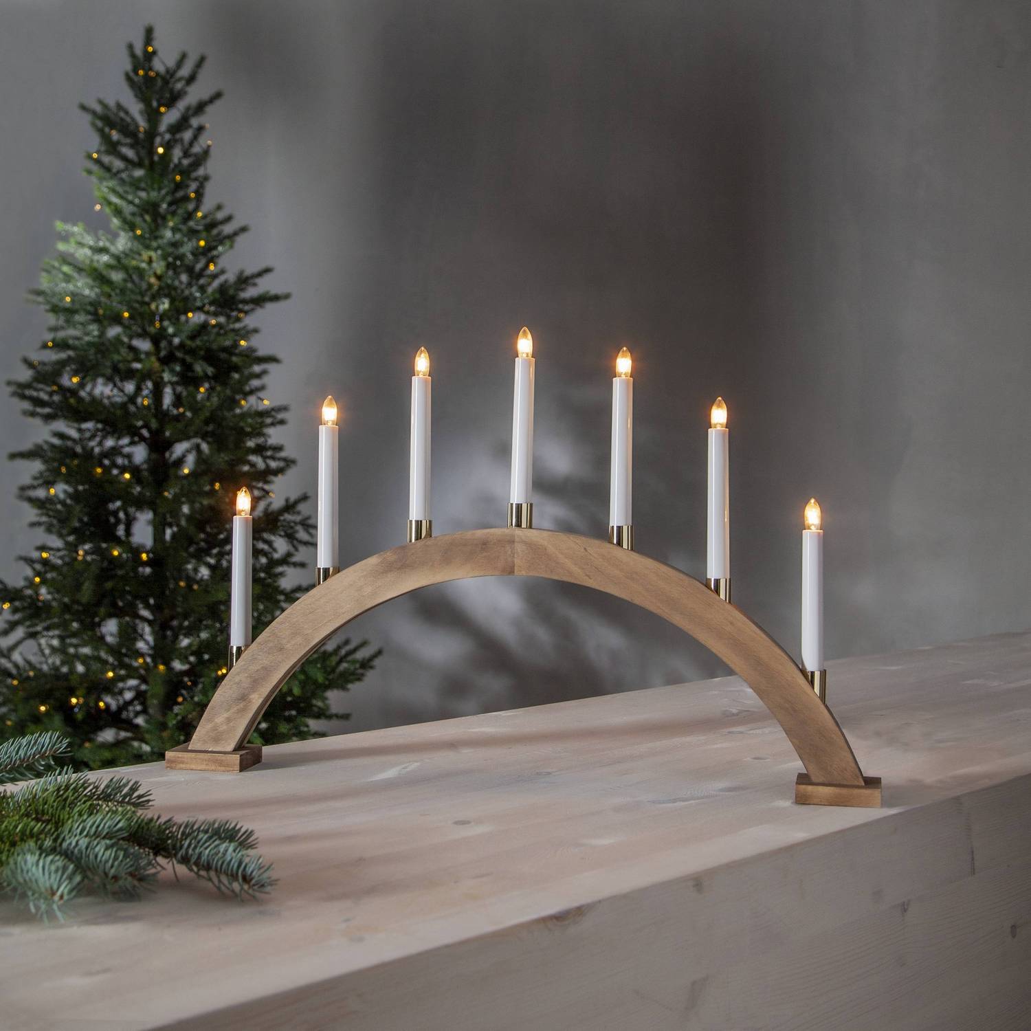 Buet lysestake i tre med messingbelagte lysestaker. Fin adventstake å pynte med til jul. Lysestaken har 7 lyskilder.