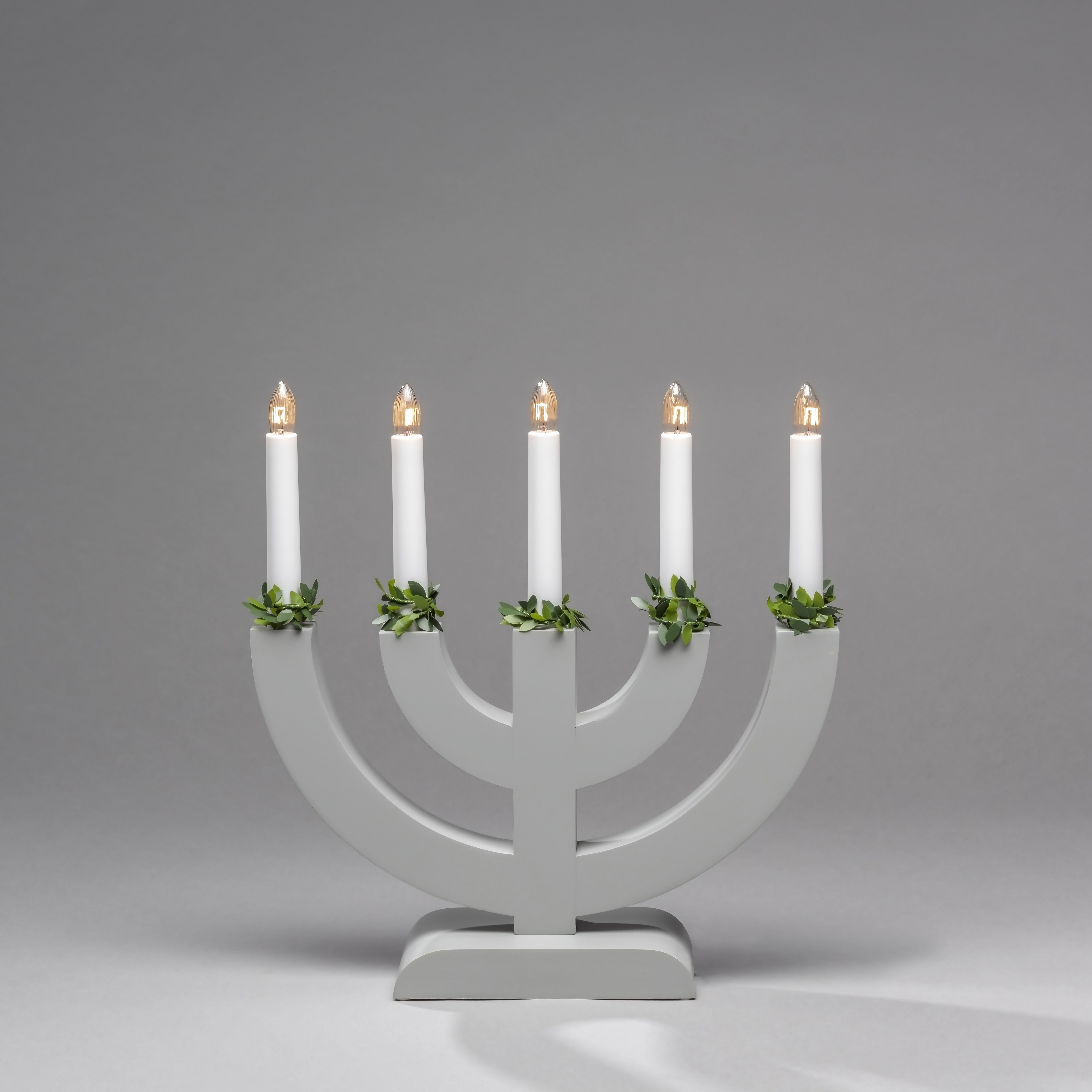 Lysestake fra Gnosjö Konstsmide med 5 lys og grønne dekorasjoner.