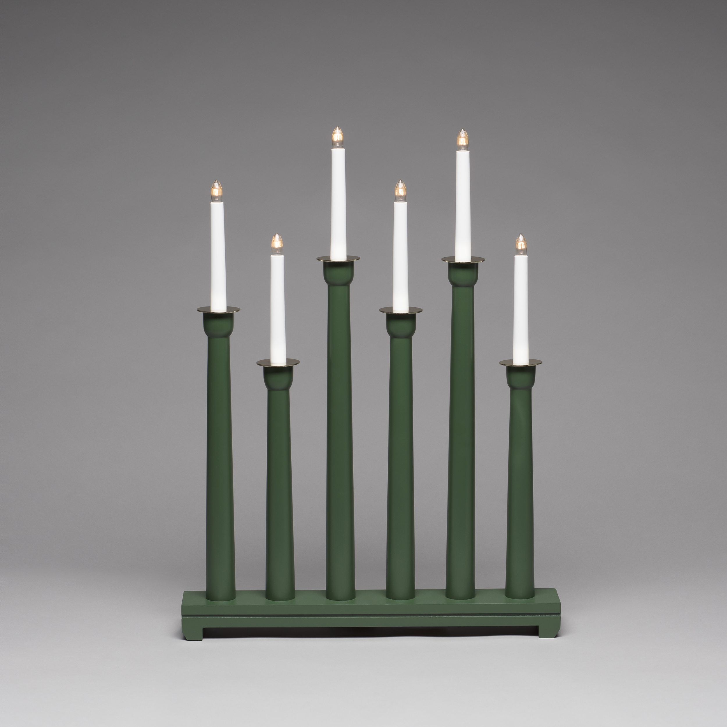 Adventsstake fra Gnosjö Konstsmide i tre med seks lys og messingdekorasjoner.