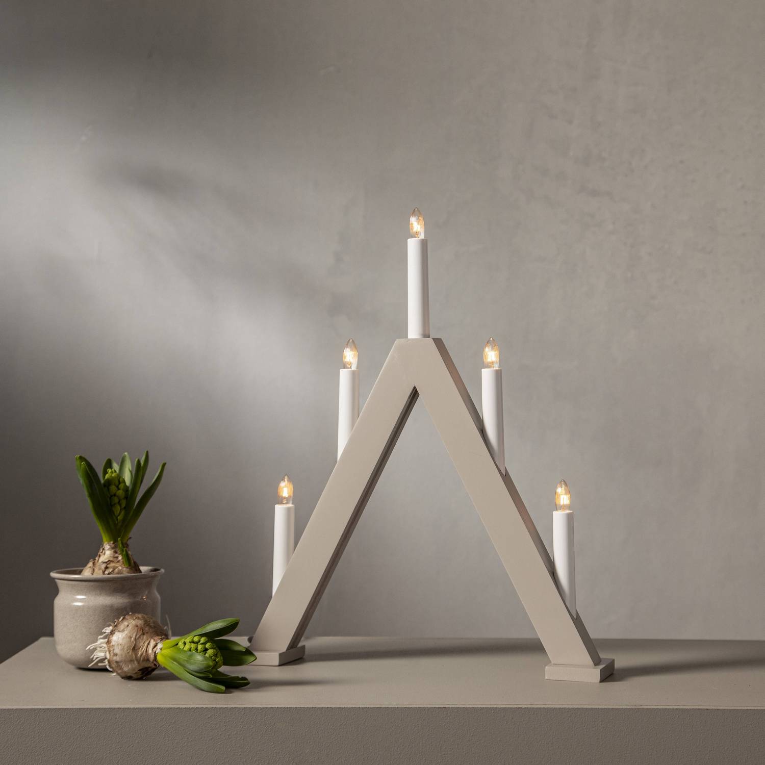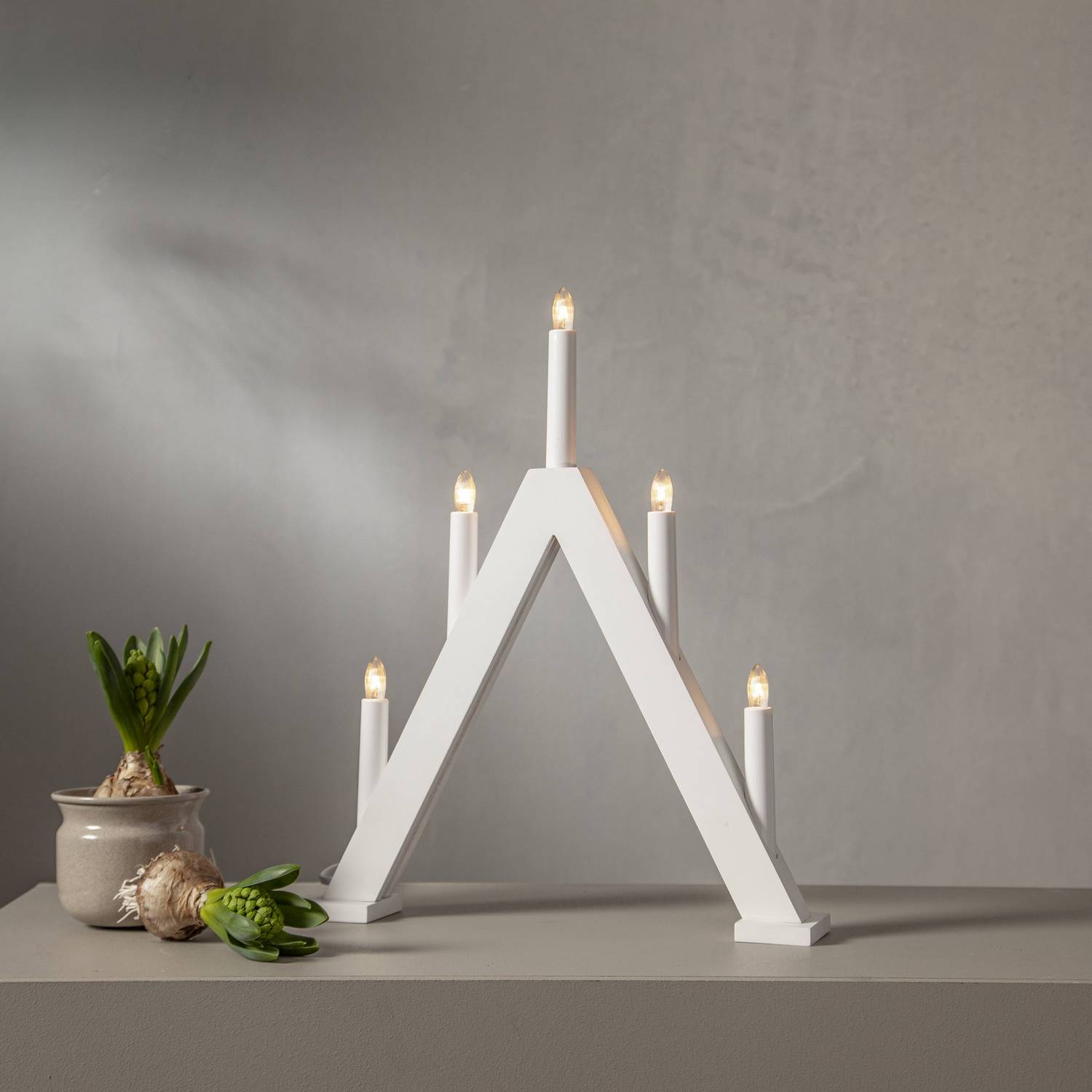 Elegant 5-armet adventstake laget av tre og malt i hvitt. Plasser den elegante lysestaken i et vindu for en herlig julestemning. Dette produktet er FSC®-merket.
