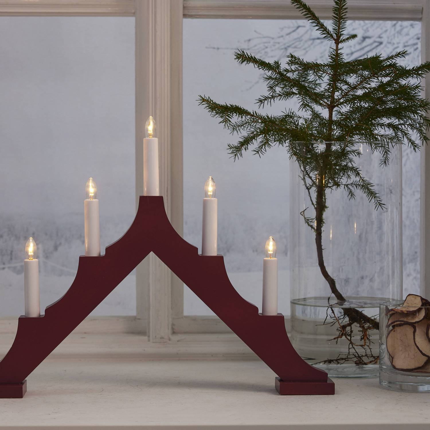 Hvit adventstake laget av tre. Klassisk formet lysestake med en moderne vri. Fin lysbilde som skaper den perfekte julestemningen i vinduet ditt. Dette produktet er FSC®-merket.