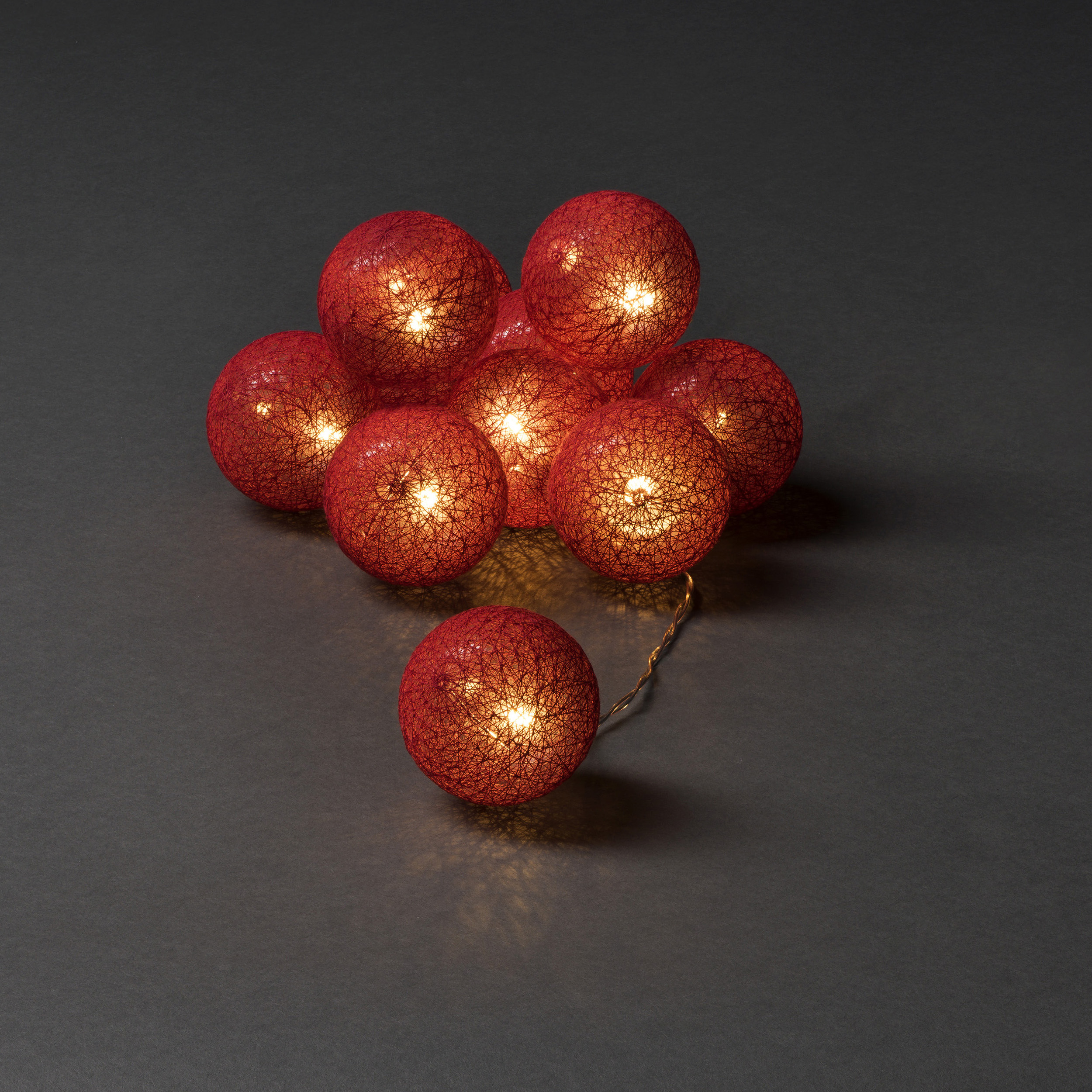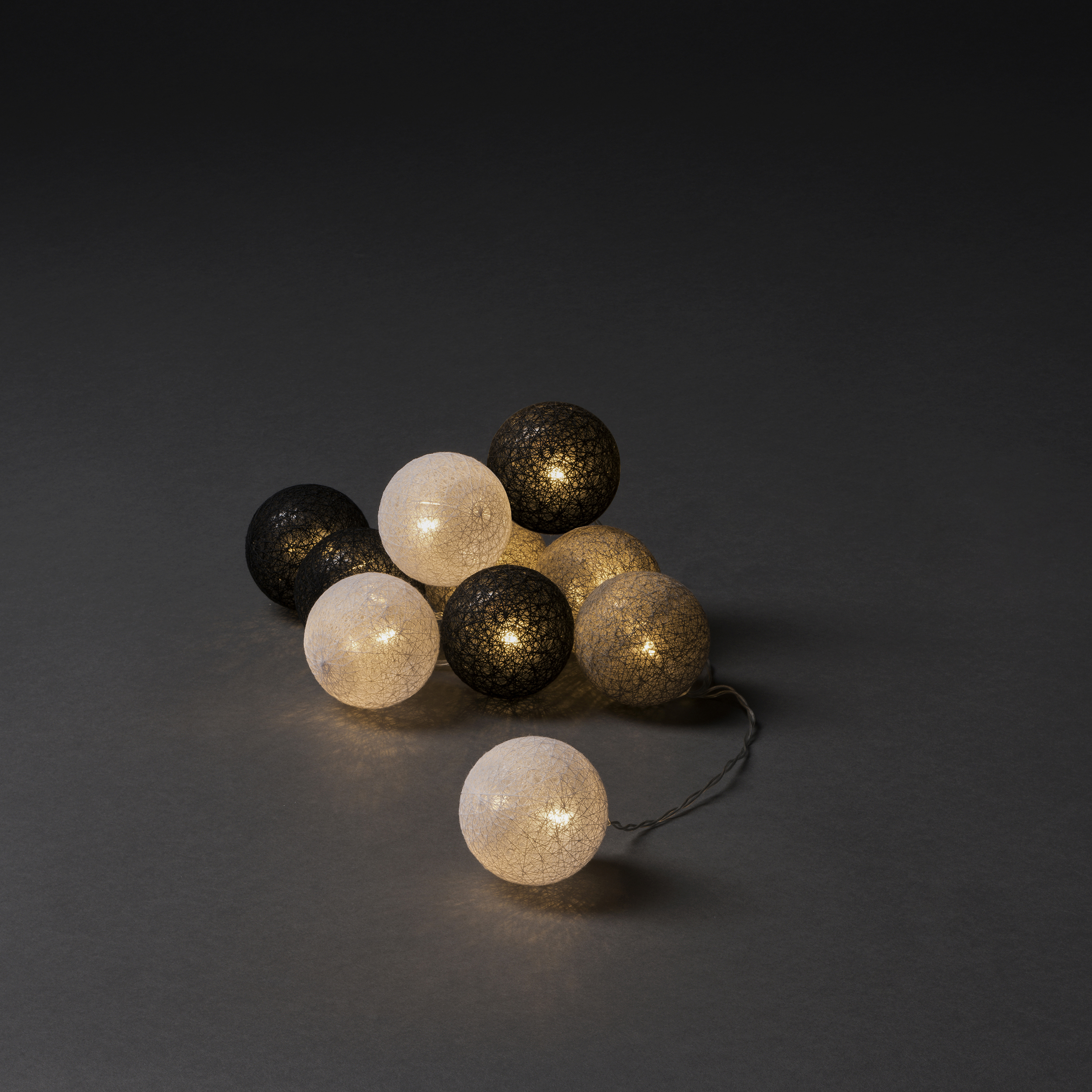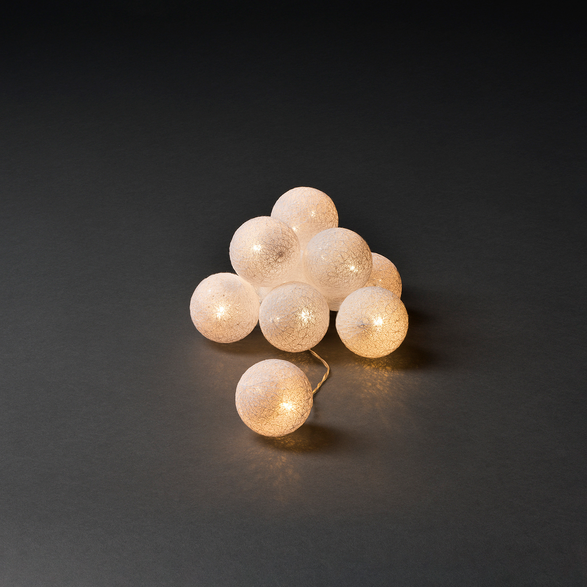 Lyslenken fra Gnosjö Konstsmide med garnballer, varmhvite LED-lys og en timer på seks timer.