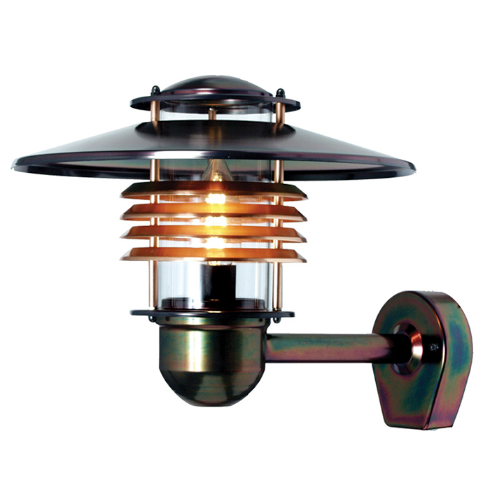 Vegglampe med rundstrålende lysspredning. Lampen har en E27-lampeholder og er godkjent for maks 75W. Bakplaten har to innganger og utganger samt hurtigkoblingsklemme. Beregnet for utendørs bruk (IP23) og passer for bruk både i private og offentlige miljøer.