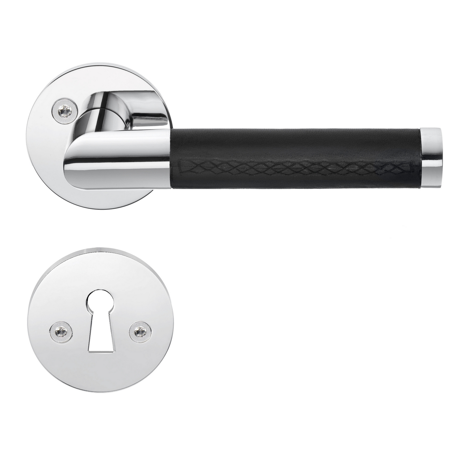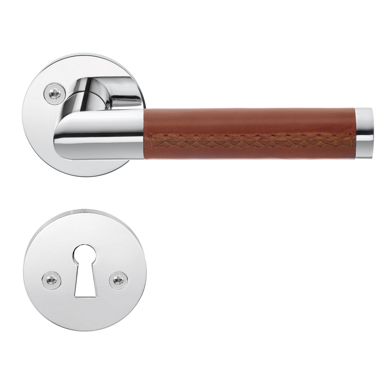 Innerdørhåndtak Beslagsboden B85 Lær er et innerdørhåndtak i polert krom med grep i lær.