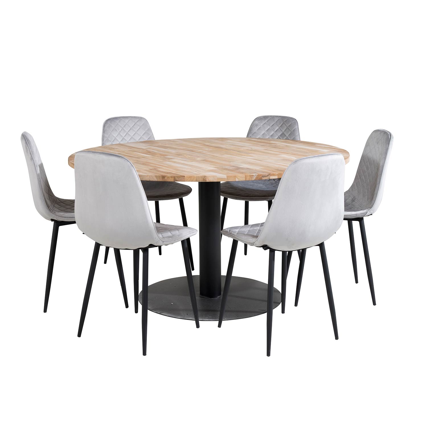 Spisegruppen Venture Home Cirebon Rund med 6 Polar Stoler er en trendy spisegruppe med et rundt Cirebon-spisebord med en bordplate i teak og et understell i metall, samt seks spisestoler i en heltrukket design med ben i sort pulverlakkert metall. Lett avrundet rygg og sete i polstret grått fløyelstoff med dekorative sømmer på innsiden av rygg og sete som danner et rutenettmønster. Enkel montering kreves.