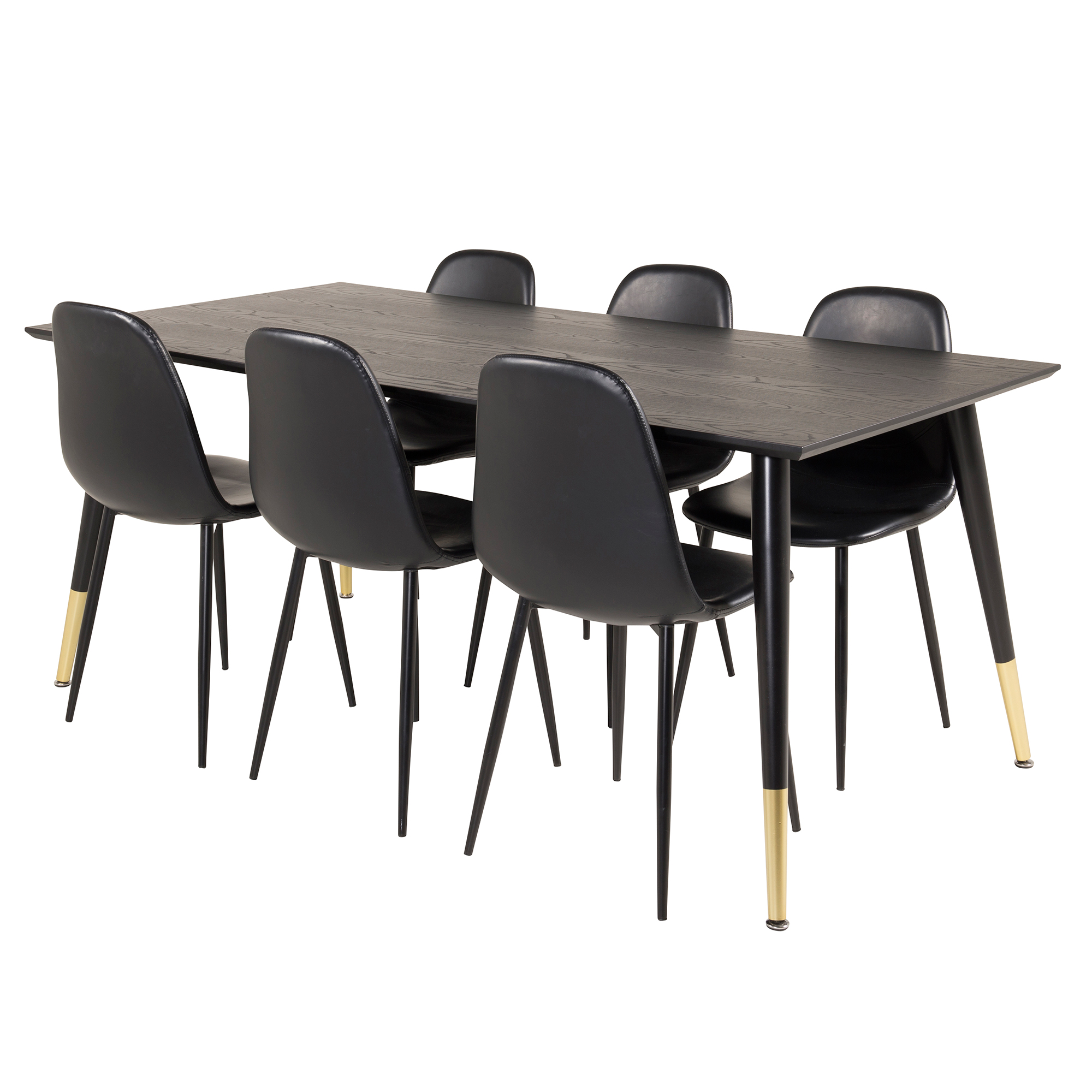 Venture Home DIpp spisegruppe med 6 Polar Stoler Polyesterstoff er en moderne spisegruppe med et rektangulært spisebord med en ramme og ben i sort pulverlakkert metall, samt en bordplate i sort finér med en kjerne i MDF. Seks spisestoler i en heltrukket design med ben i sort pulverlakkert metall, med en lett avrundet rygg og sete i polyesterstoff, følger med. Enkel montering kreves.