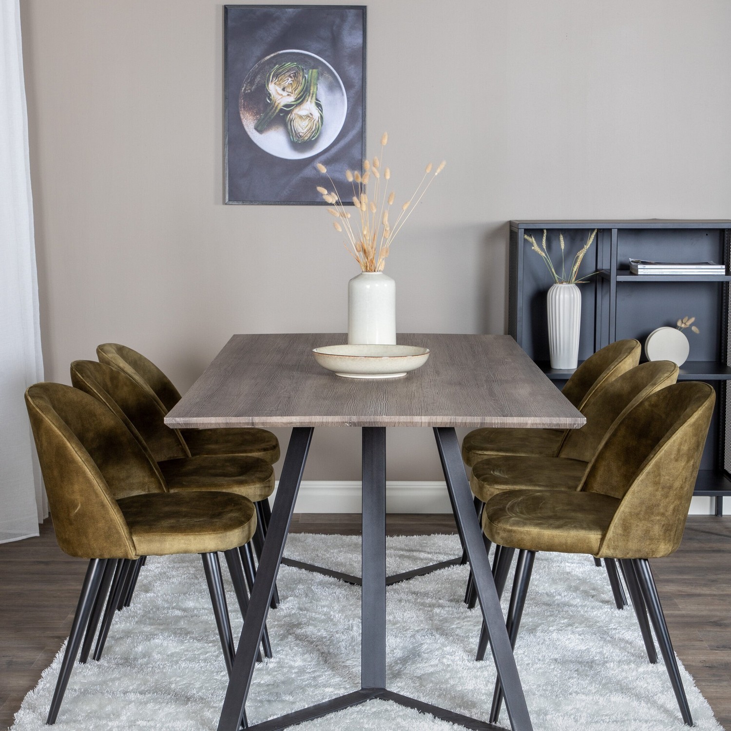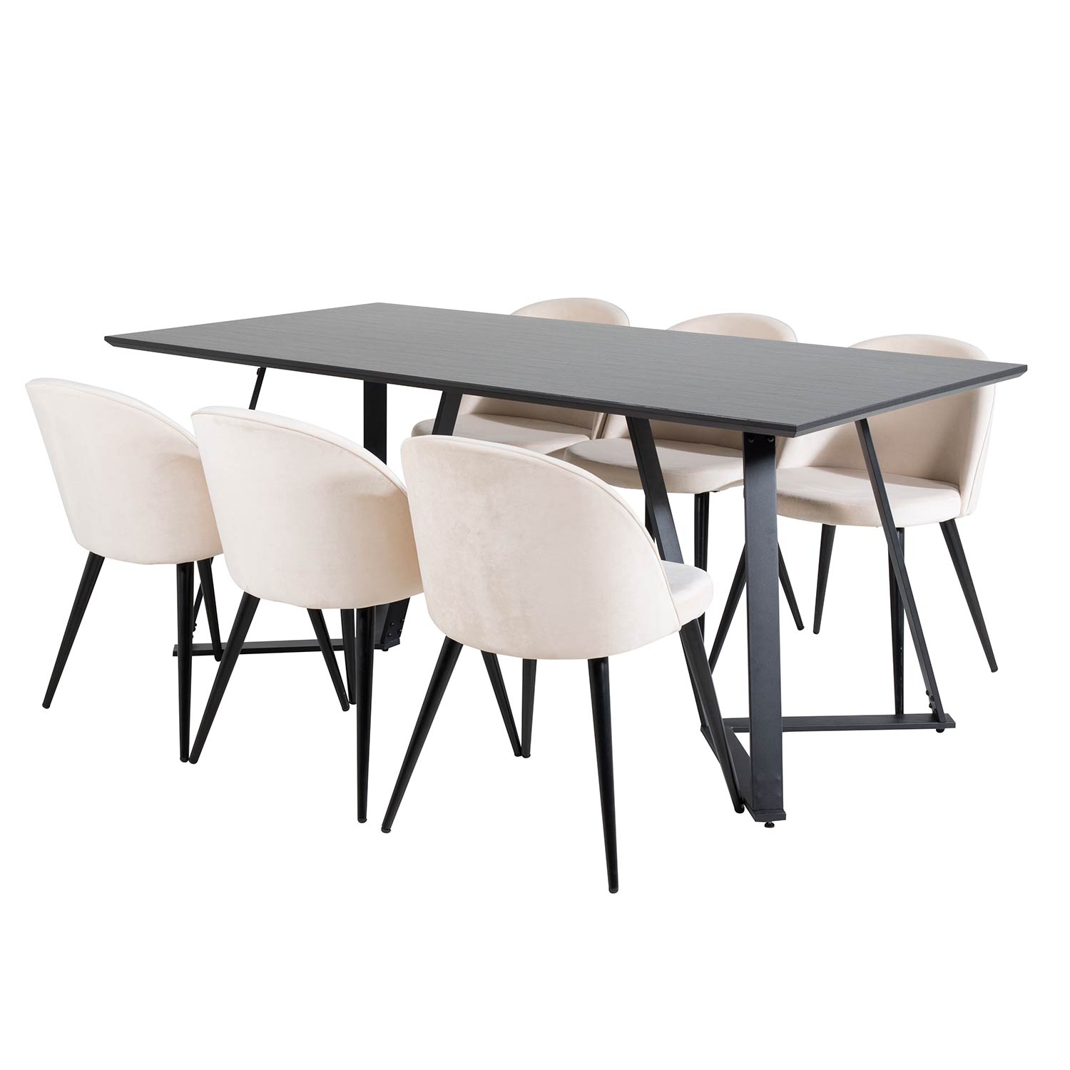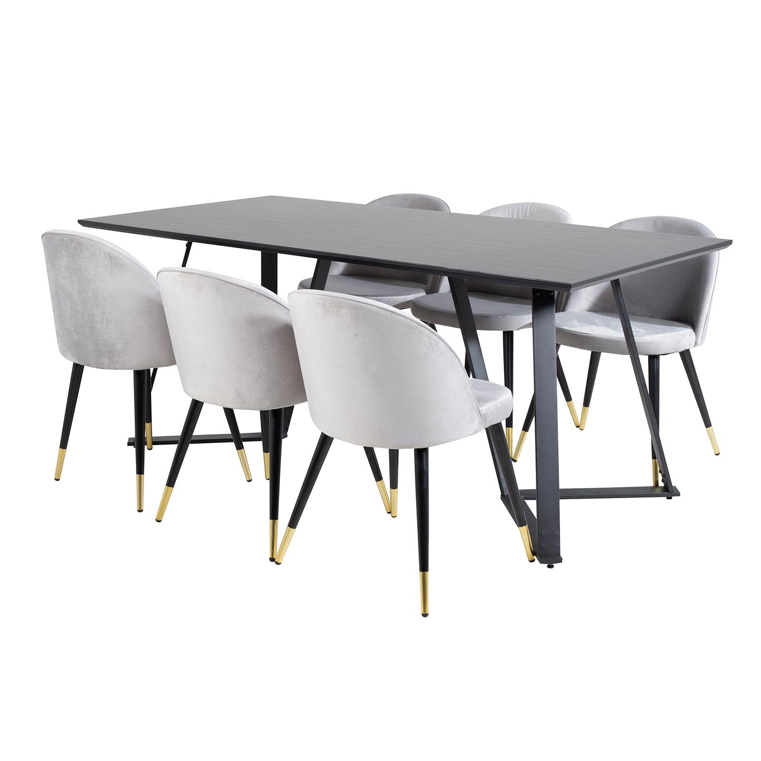 Spisegruppe Venture Home Madde med 6 Valentina Stoler Sammet er en stilig spisegruppe med et spisebord i MDF med svarte bordben i metall. Det følger med seks spisestoler med svarte stolben i metall og seter i fløyel.