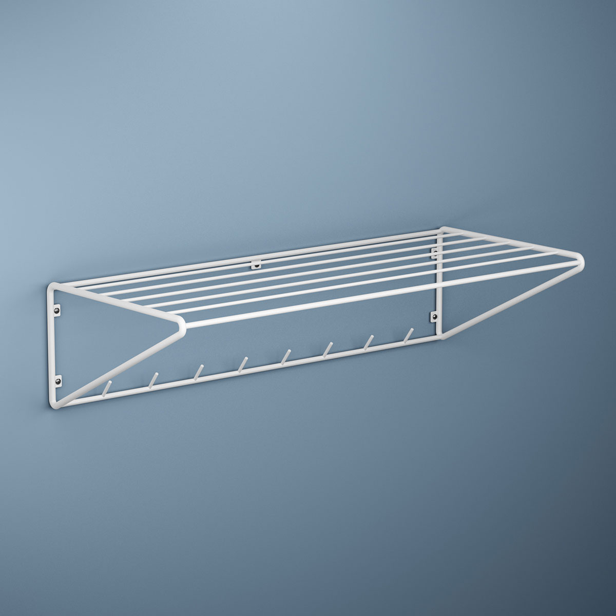 Et av hjemmets viktigste rom er gangen. Hedda er en enkel, funksjonell og stilren veggmontert hatt-hylle i pulverlakkert metall. Hatthyllen har en praktisk oppbevaringsflate på toppen for skjerf, hatter, hansker osv. 8 kroker og en stang for kleshengere.