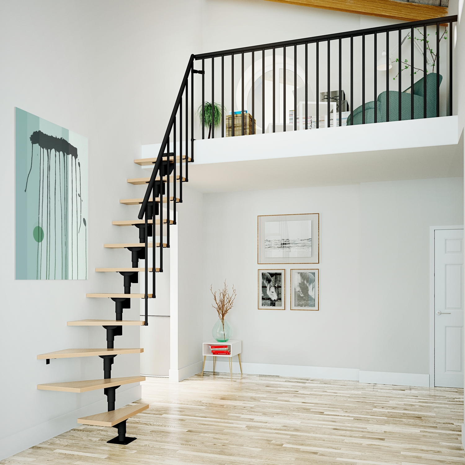 Plassbesparende Trapp Dolle Dallas Onebox 1/4-Sving fremstår som en lett og elegant modultrapp. Trappen har 11 multiplex trinn i lakkert tre. Den maksimale høyden er 300 cm, og om du vil ha mer sikkerhet rundt trappen i overetasjen er det mulig å legge til rekkeverk.