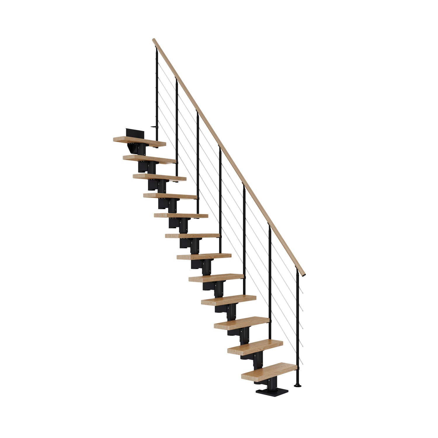 Trappen leveres med 11-15 trinn i heltre for en maksimumshøyde gulv-til-gulv på 360 cm. Benyttes det 13-15 trinn må støttestolpe monteres, denne er inkludert i pakken. Trenger du en lavere trapp, fjerner du bare trinn slik at du oppnår riktig høyde. Trinnene har en overflate som er slitesterk, ripebestandig og enkel å rengjøre takket være halvblank lakk. Høyden på hvert trinn kan justeres mellom 18,5 og 22,5 cm. Vær oppmerksom på at trappen krever etasjeskiller på minimum 20 cm.