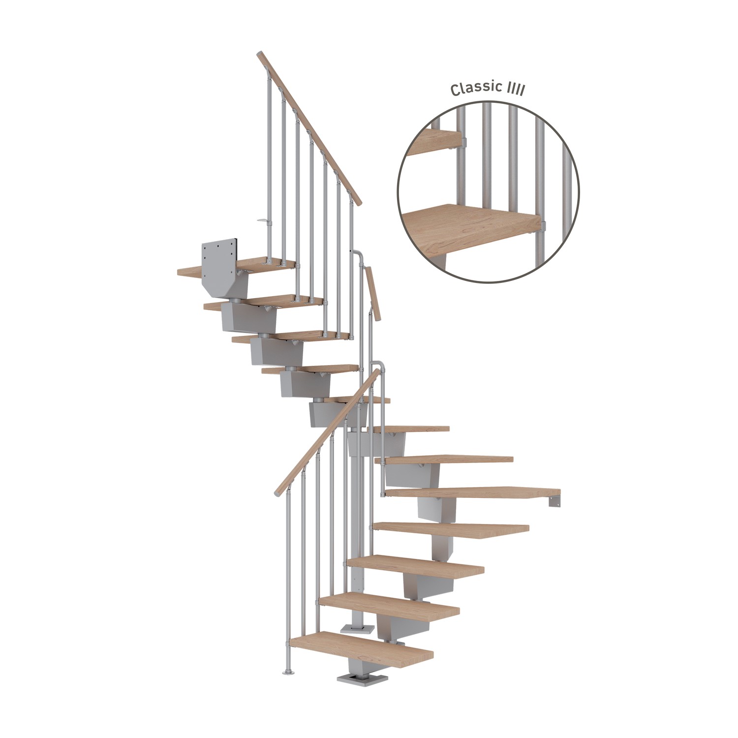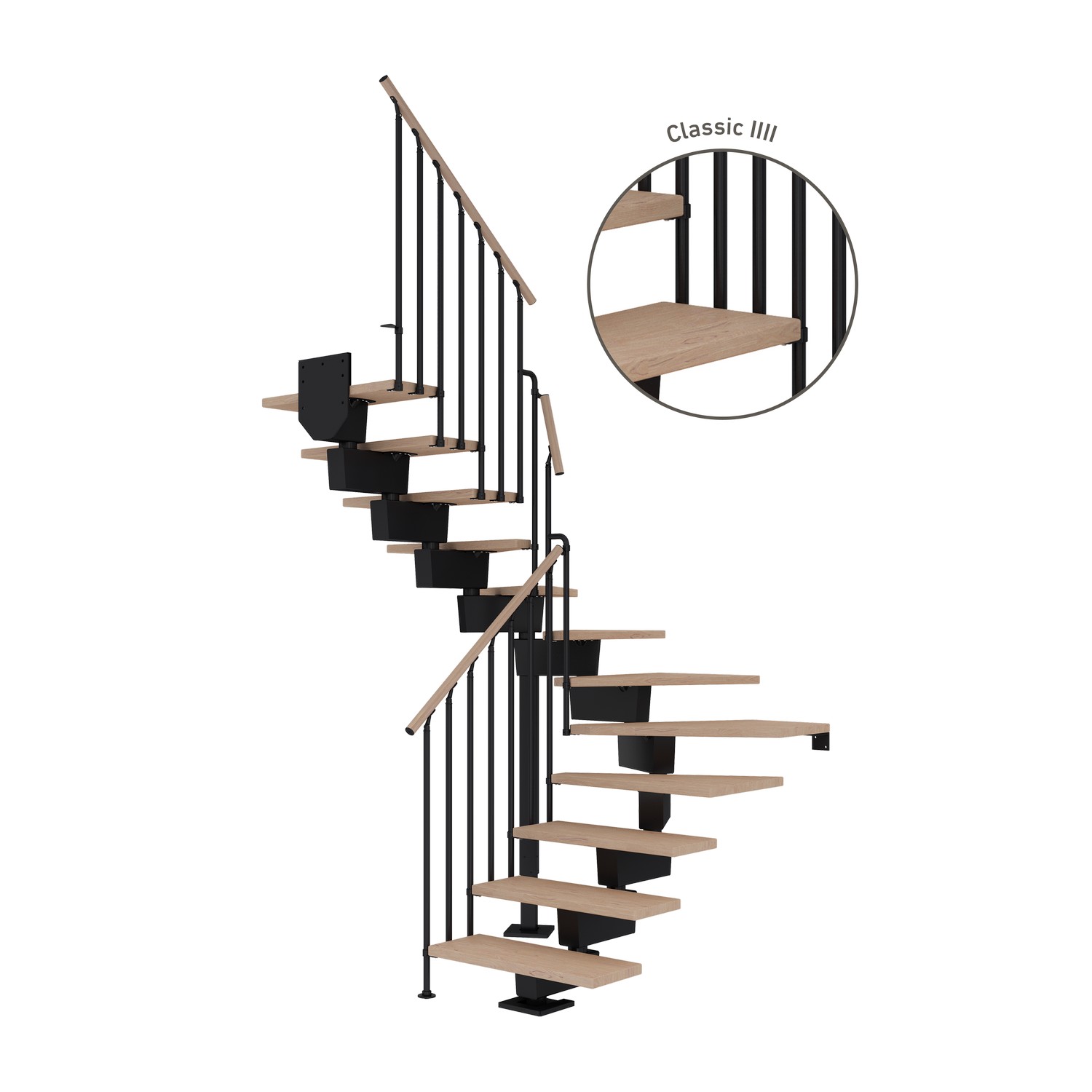 Trappen krever en etasjeskiller på minimum 20 cm og håndløperen leveres i lengder á 150 cm.