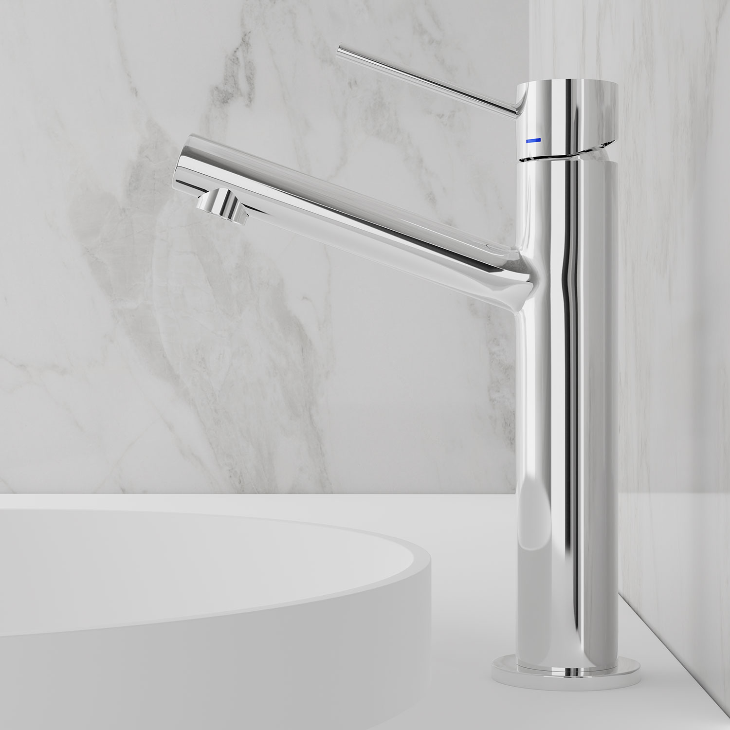 Servantbatteri Scandtap Steel Vector Medium i slankt design med moderne innslag. Formgitt med diagonale linjer og i minimalistisk utførelse. En middels høy modell uten skjøt som passer utmerket til innfelte servanter og nedsenkede servanter for ekstra armslag. Utstyrt med kvalitetskomponenter som sparer vann og opprettholder en perfekt tilpasset vannstrøm. Neoperl koblingsslange med 10 mm glatt ende.