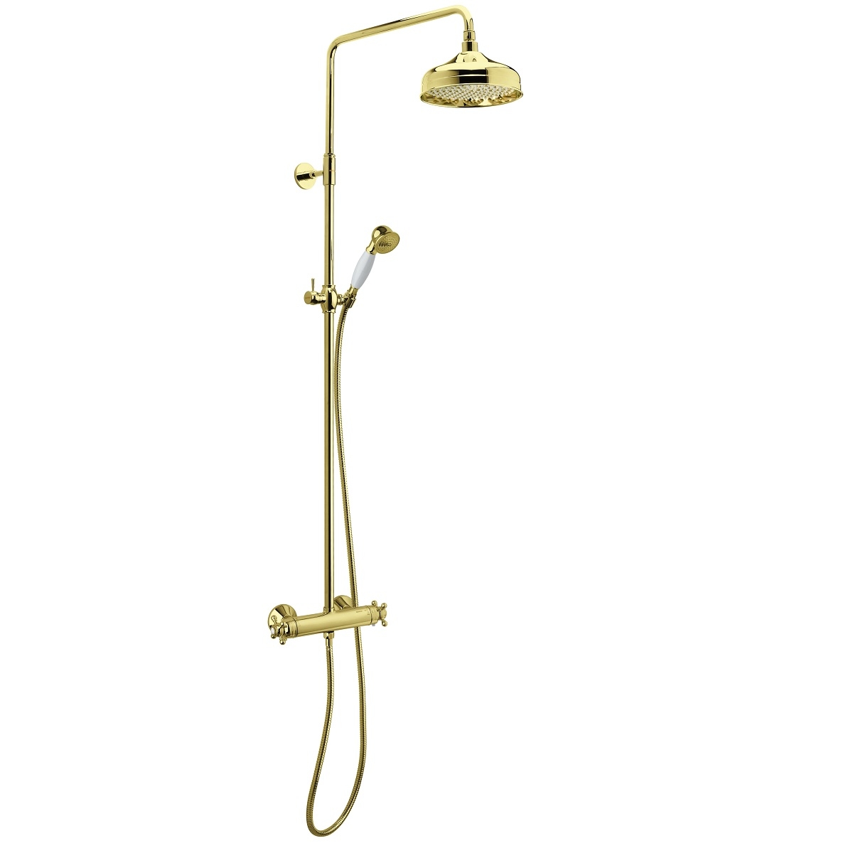 Nostalgisk takdusj med 200mm dusjhode. Hånddusj med porselensdetaljer. Justerbar høyde på stang 1020-1250mm. Eco-save og skoldesperre på termostatkran. Metallslange med anti-twist.