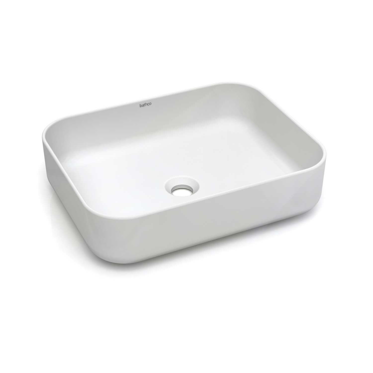 Bathco Dinan servanten Ø50 er en rektangulær servant laget av matt porselen med avrundede hjørner. Den har ingen overløp og måler 390x500mm med en høyde på 135mm.