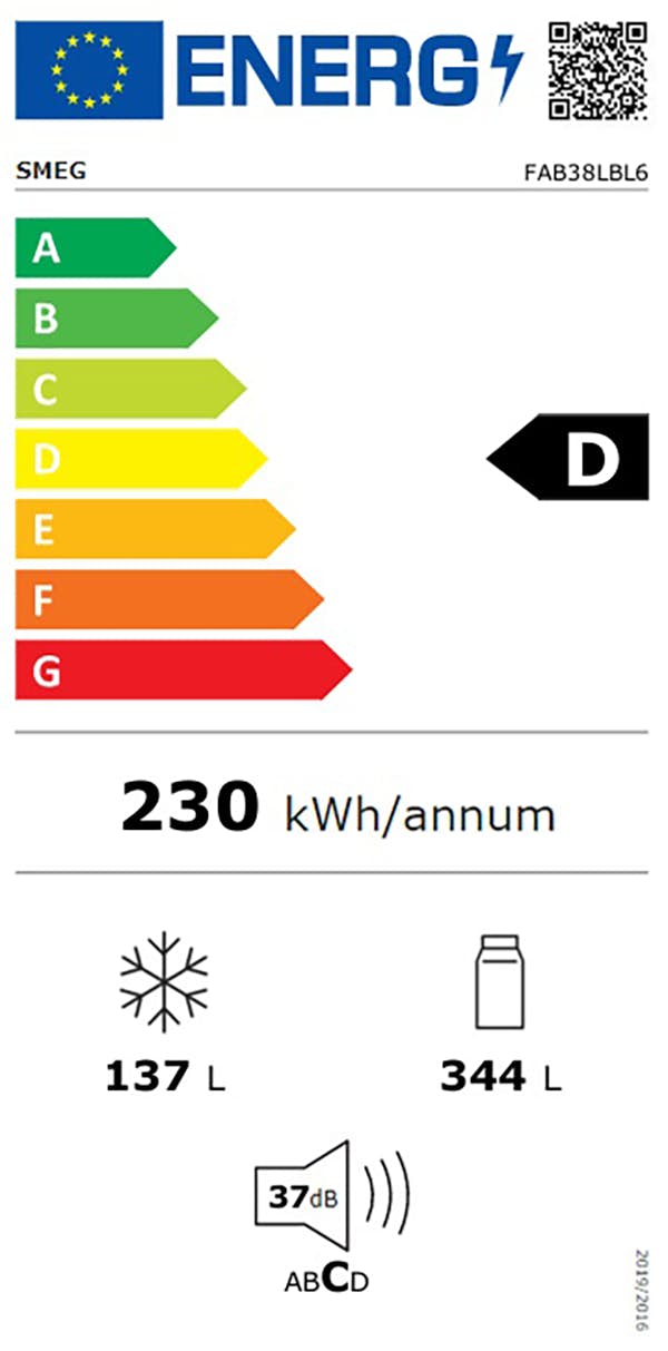 Med en inverterkompressor, kjølemiddel R600a og et årlig energibehov på bare 230 kWh, er FAB38RCR6 både stille og energieffektiv. Lydnivået er så lavt som 37 dB(A), noe som gjør at skapet knapt merkes i et åpent kjøkken. Energiklassen er D i henhold til den nye energimerkingen og støynivået er klassifisert i kategori C.