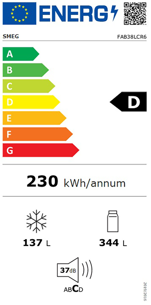 Med en inverterkompressor, kjølemiddel R600a og et årlig energibehov på bare 230 kWh, er FAB38RCR6 både stille og energieffektiv. Lydnivået er så lavt som 37 dB(A), noe som gjør at skapet knapt merkes i et åpent kjøkken. Energieffektivitetsklassen er D i henhold til den nye energimerkingen, og støynivået er klassifisert i kategori C.