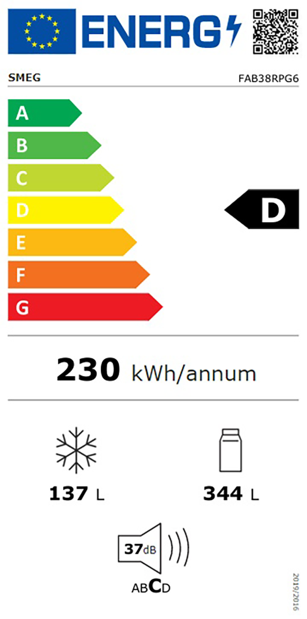 Med en inverterkompressor, kjølemiddel R600a og et årlig energibehov på bare 230 kWh, er FAB38RCR6 både stille og energieffektiv. Lydnivået er så lavt som 37 dB(A), noe som gjør at skapet knapt merkes i et åpent kjøkken. Energiklassen er D i henhold til den nye energimerkingen, og støynivået er klassifisert i kategori C.