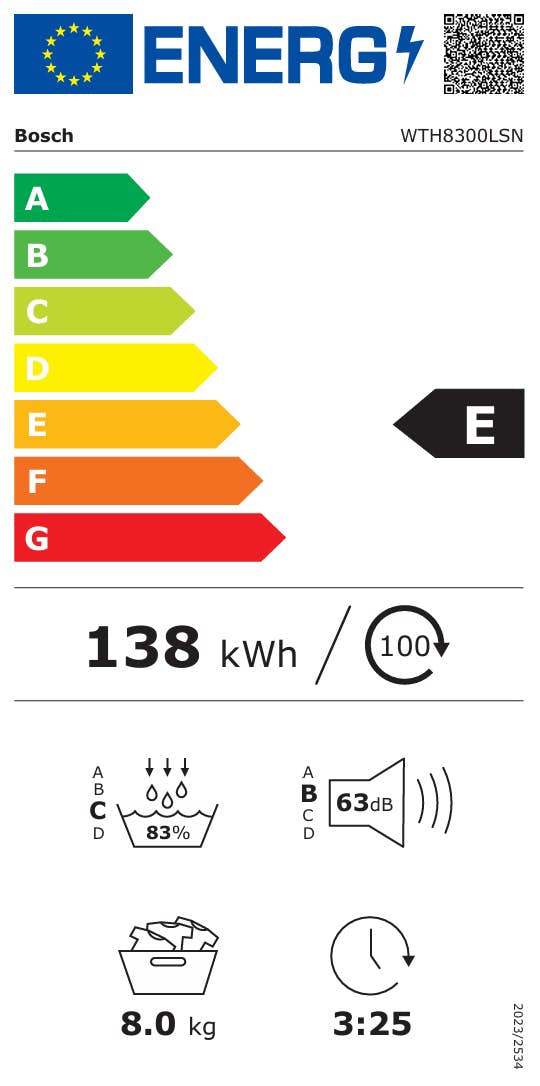 Ved å bruke energibesparende husholdningsapparater sparer du på verdifulle ressurser. Derfor bør du tenke på lavt energi- og vannforbruk når du kjøper en husholdningsapparat. Energimerkingen angir effektivitetsklasse, støynivå, kapasitet, energi- og vannforbruk for det aktuelle produktet. Den viktigste endringen i de nye energimerkingene er elimineringen av effektivitetsklassene som for eksempel A+++. Den nye effektivitetsklassen vil være fra A til G for vaskemaskiner. Takket være vårt høyeffektive energisparende system oppnår våre Bosch vaskemaskiner den beste energiklassen A uten å kompromittere med resultatet.
